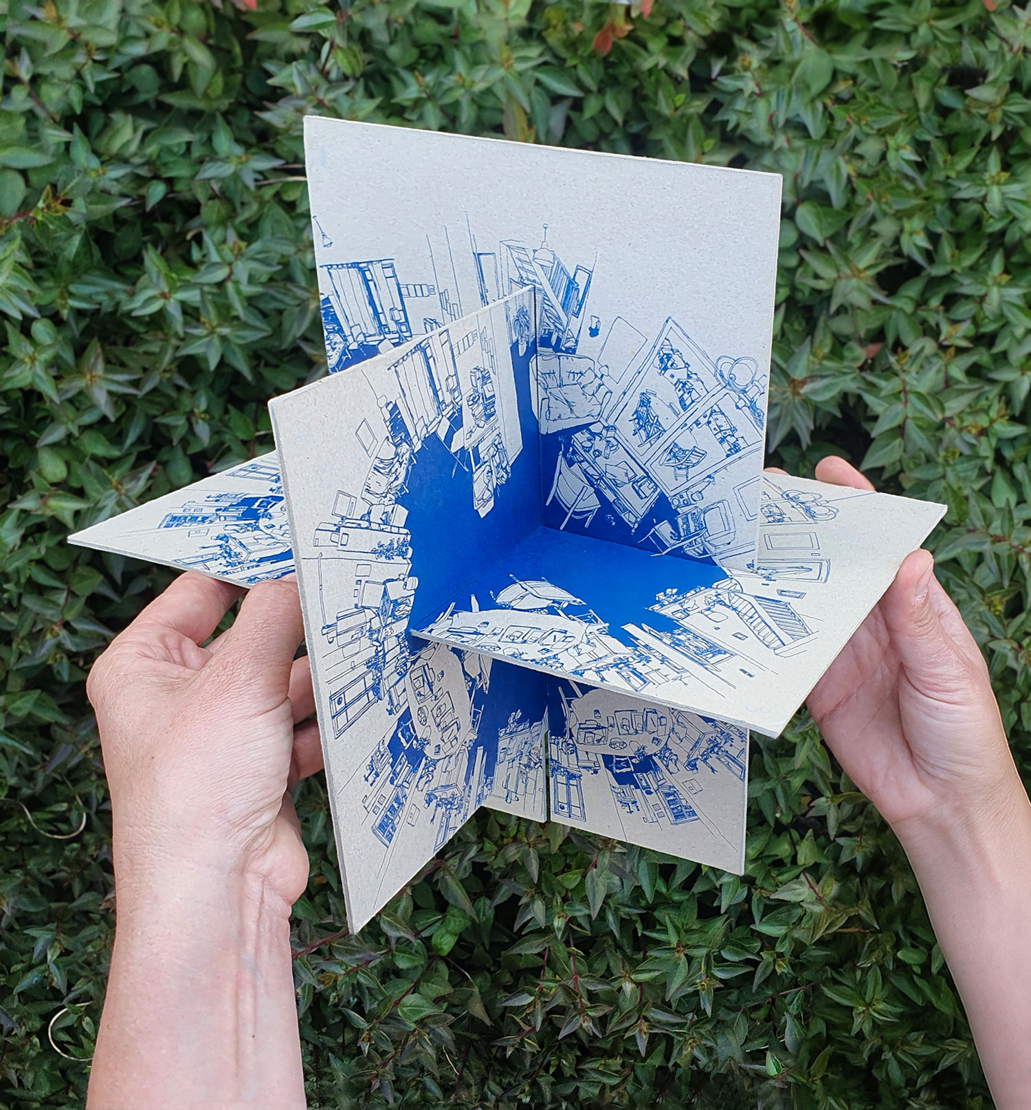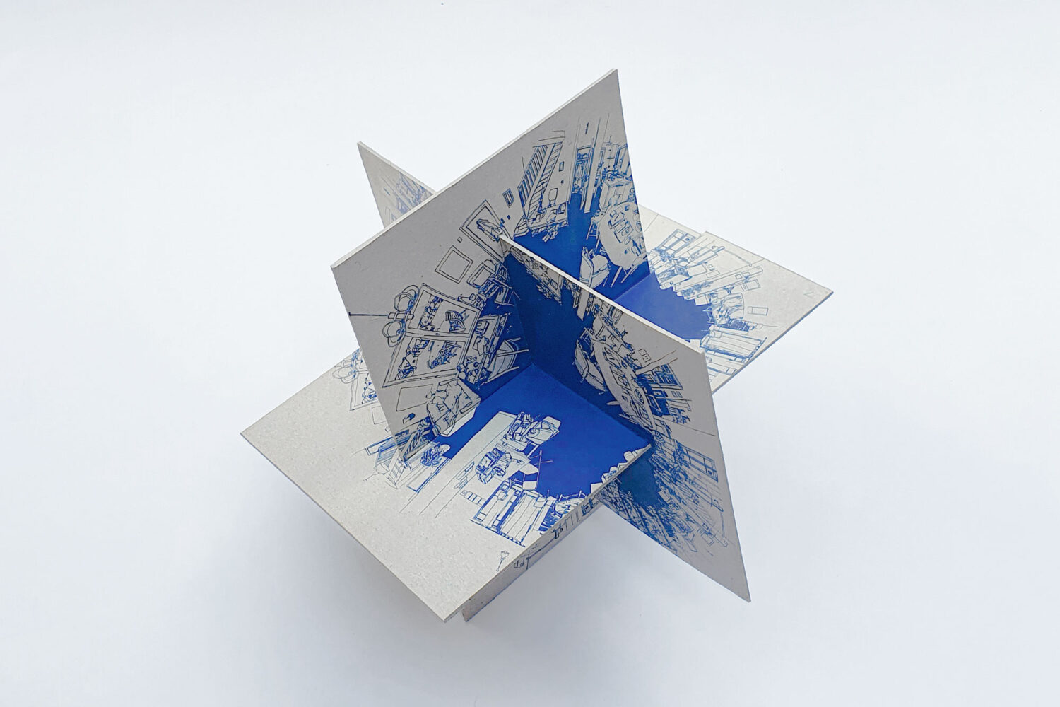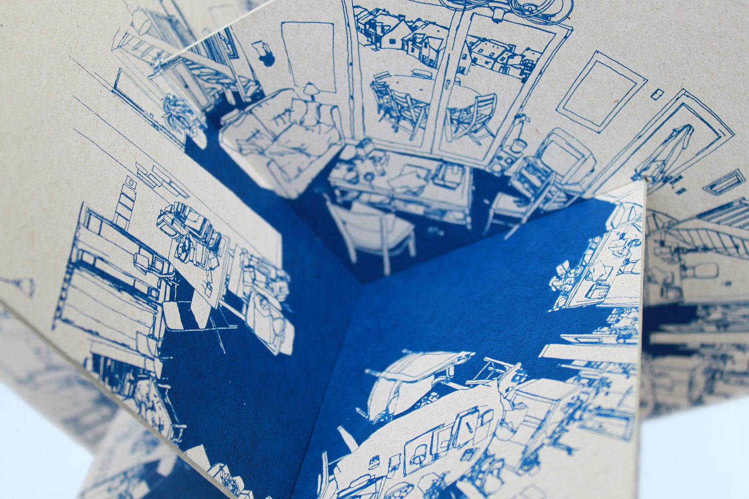 Nodus, autoédition, 2011.Trois feuilles de carton sérigraphiées recto/verso s’emboîtant les unes dans les autres.Format de chaque feuille : 18 x 26 cm.